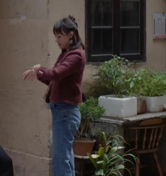 第五套 酒红色小香风配牛仔裤